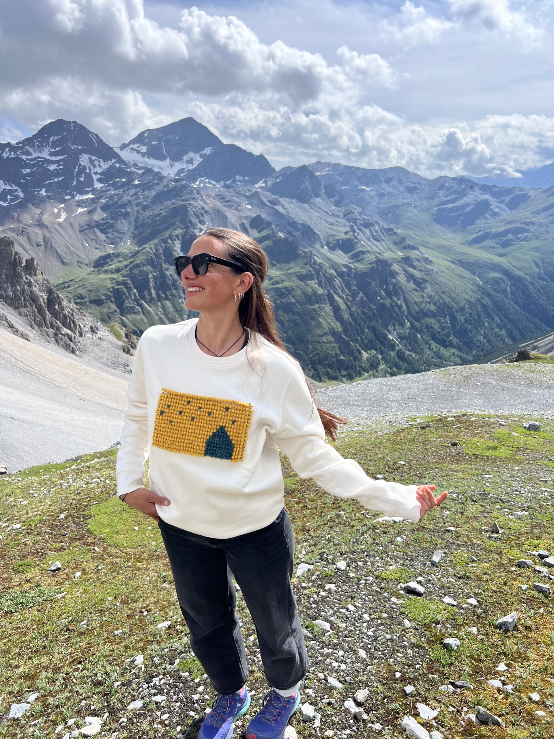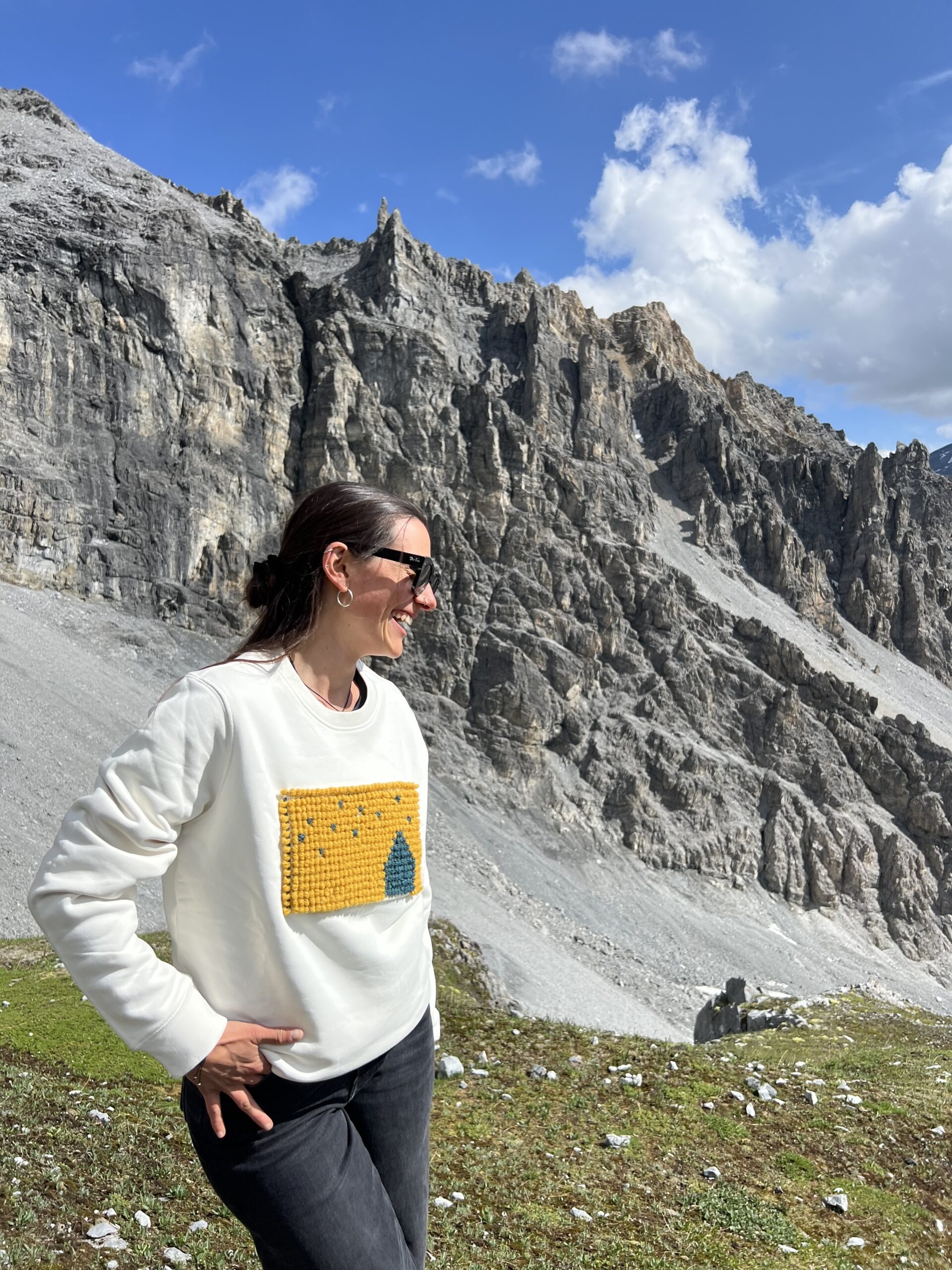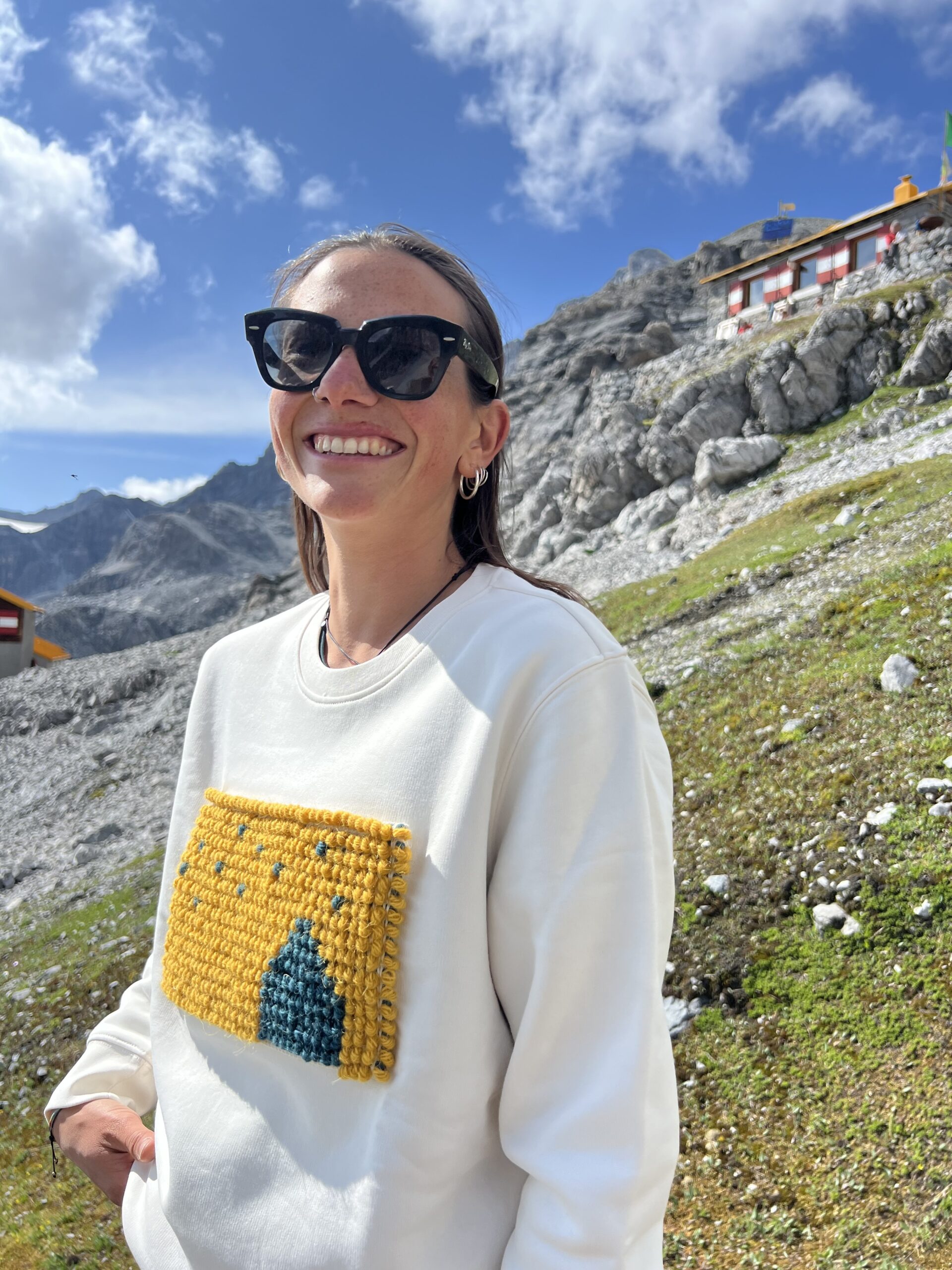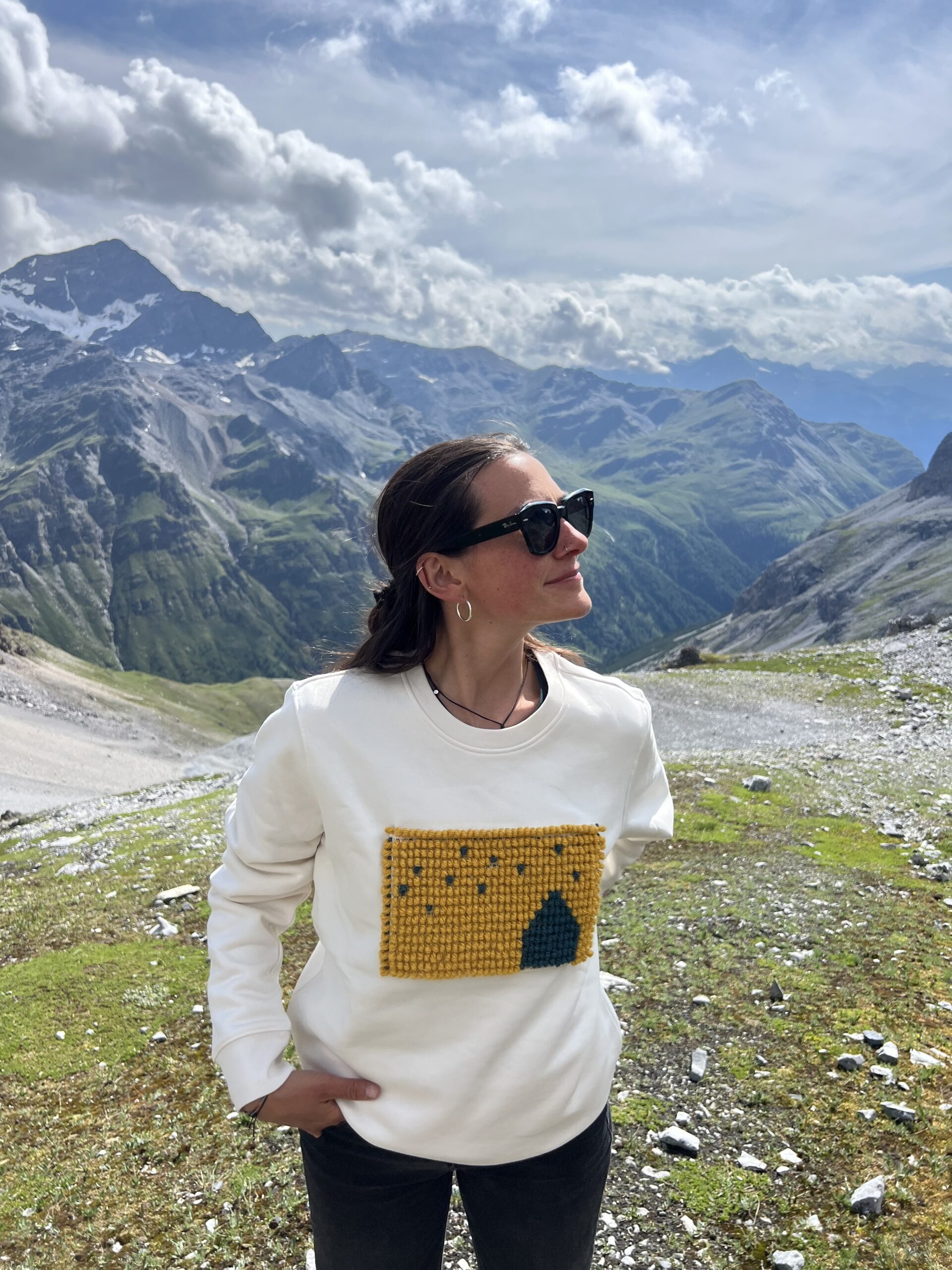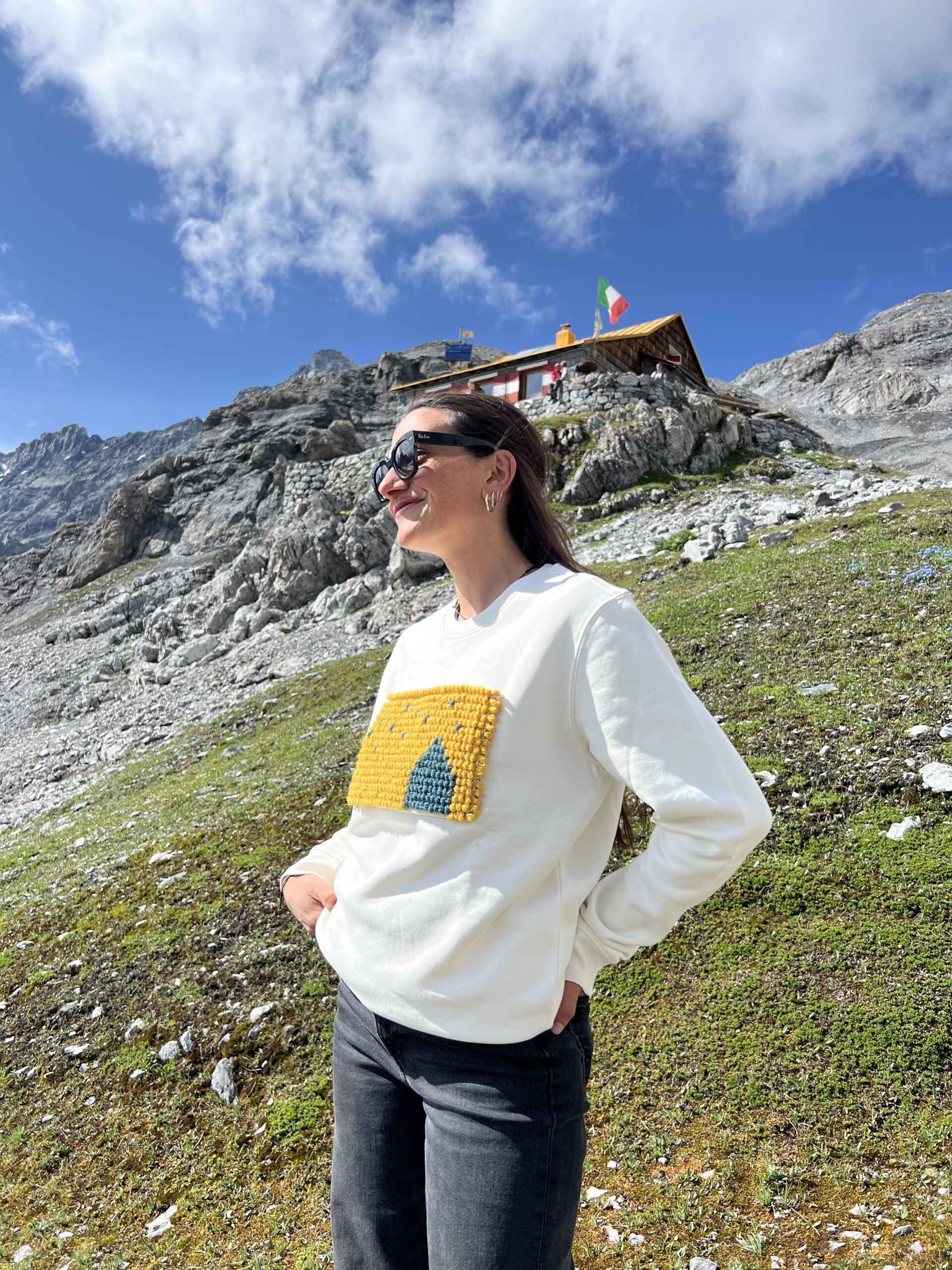 Presenta un applicazione in lana disegnata e realizzata su telaio antico dal laboratorio di tessitura artigianale sardo di Vilma e Mariarosa. La patch è ispirata al cielo stellato del rifugio.